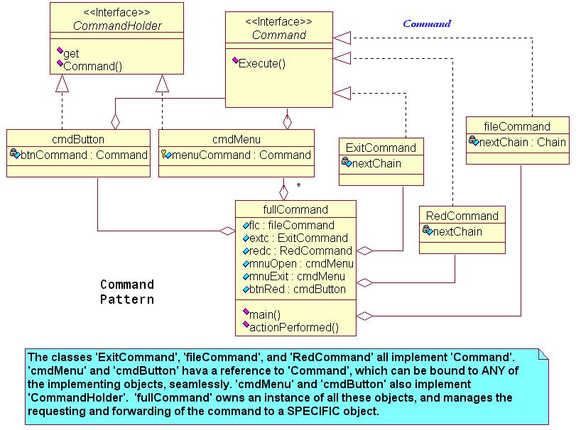 Pattern Concept: to handle a request by forwarding it to a SPECIFIC object. Details on the specific actions needed and a specific interface are enclosed in the forwarded object. The key here is that the knowledge of the specific actions and interface do not need to be embedded in the requesting object. This allows easy changing of the actions without changing the program itself.